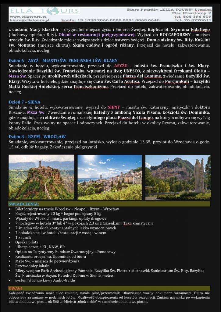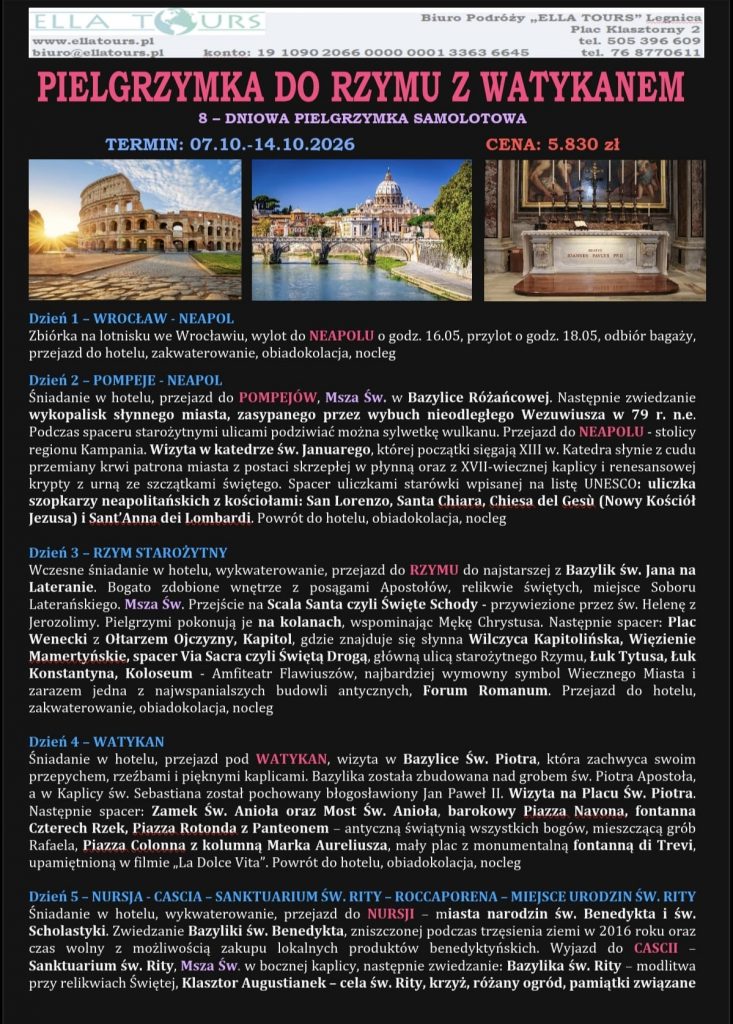 W październiku organizujemy parafialną pielgrzymkę do Włoch – m.in. do Rzymu, Neapolu, Pompei, Asyżu i Casci. Zapisy do 10 kwietnia. Więcej szczegółów oraz program dostępny w gablocie, zakrystii, na stronie internetowej, a także u ks. Pawła.