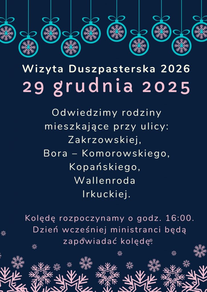 W tym roku, wyjątkowo wcześniej, bo już jutro, rozpoczniemy w naszej Parafii, w sposób tradycyjny, doroczne odwiedziny duszpasterskie, tak zwaną kolędę. Niebawem na naszej stronie internetowej, Facebooku i tablicy ogłoszeń przy kościele pojawi się grafik na cały styczeń.